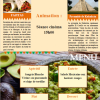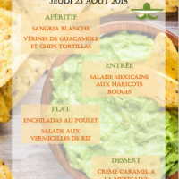 Publiée le 10/08/2018Jeudi 23 août 2018 aura lieu la journée à thème du mois. En ce mois d'août, le Mexique sera à l'honneur avec au menu : Apéritif : Sangria blanche - verrines de Guacamole et chips tortillas Entrée : Salade Mexica [...] Lire la suite